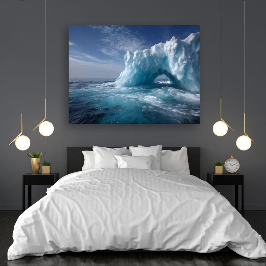 A tranquil meditation on the ephemeral beauty of the Arctic and the enduring power of the sea. This piece captures a momentary Arch of Ice, a sculptural anomaly carved by the ocean, bathed in a celestial light. The cool, light blue and white palette embodies the Japandi principle of Seijaku (静寂), transforming raw nature into a scene of pristine, quiet luxury. It invites the viewer into a vast, silent space, perfect for minimalist interiors seeking a touch of profound serenity.