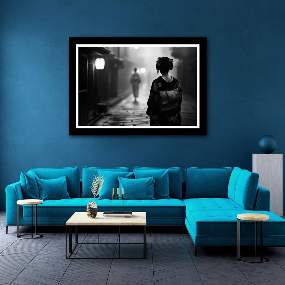 Description: A Kyoto alley, enveloped in mist, where the soft light of lanterns bleeds into the air. A distant figure fades away while a quiet back gazes forward, inviting the viewer into a story. This piece brings a profound silence and a sense of nostalgia for a lost time, adding a cinematic scene to any room.