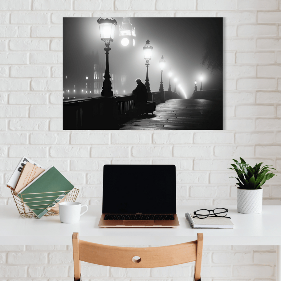 ”Reminiscence" expressed our memories through this minimal artwork. Beautiful AI Generated black and white night bridge with old man makes us calm and relax.”